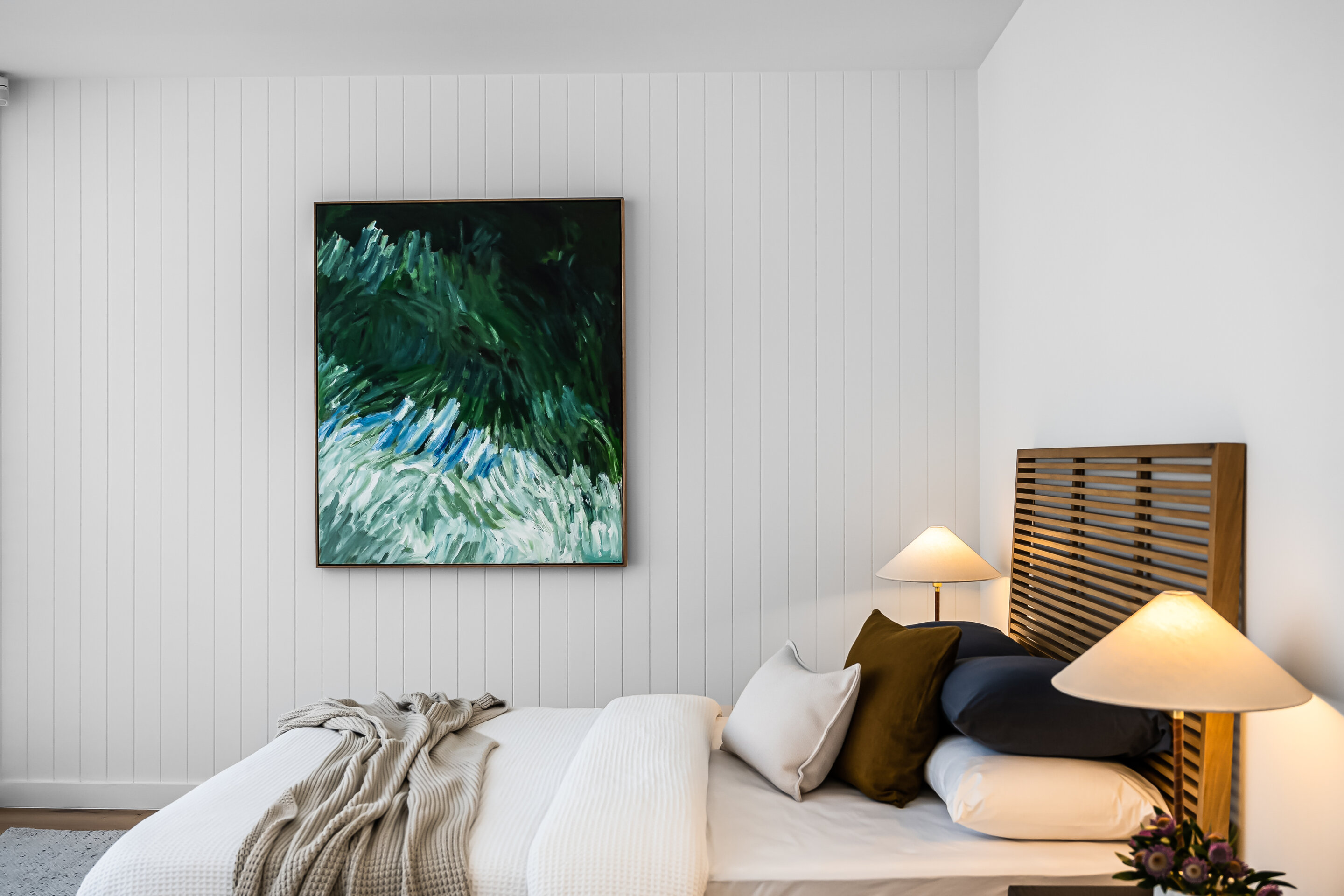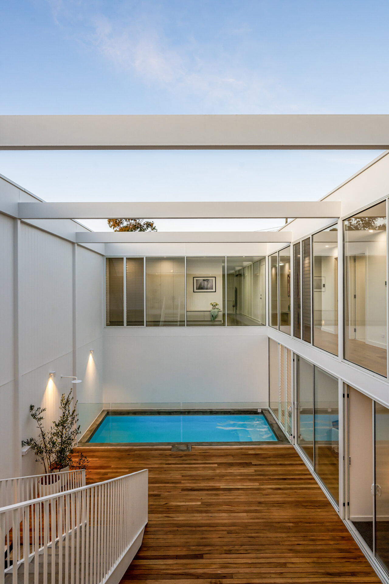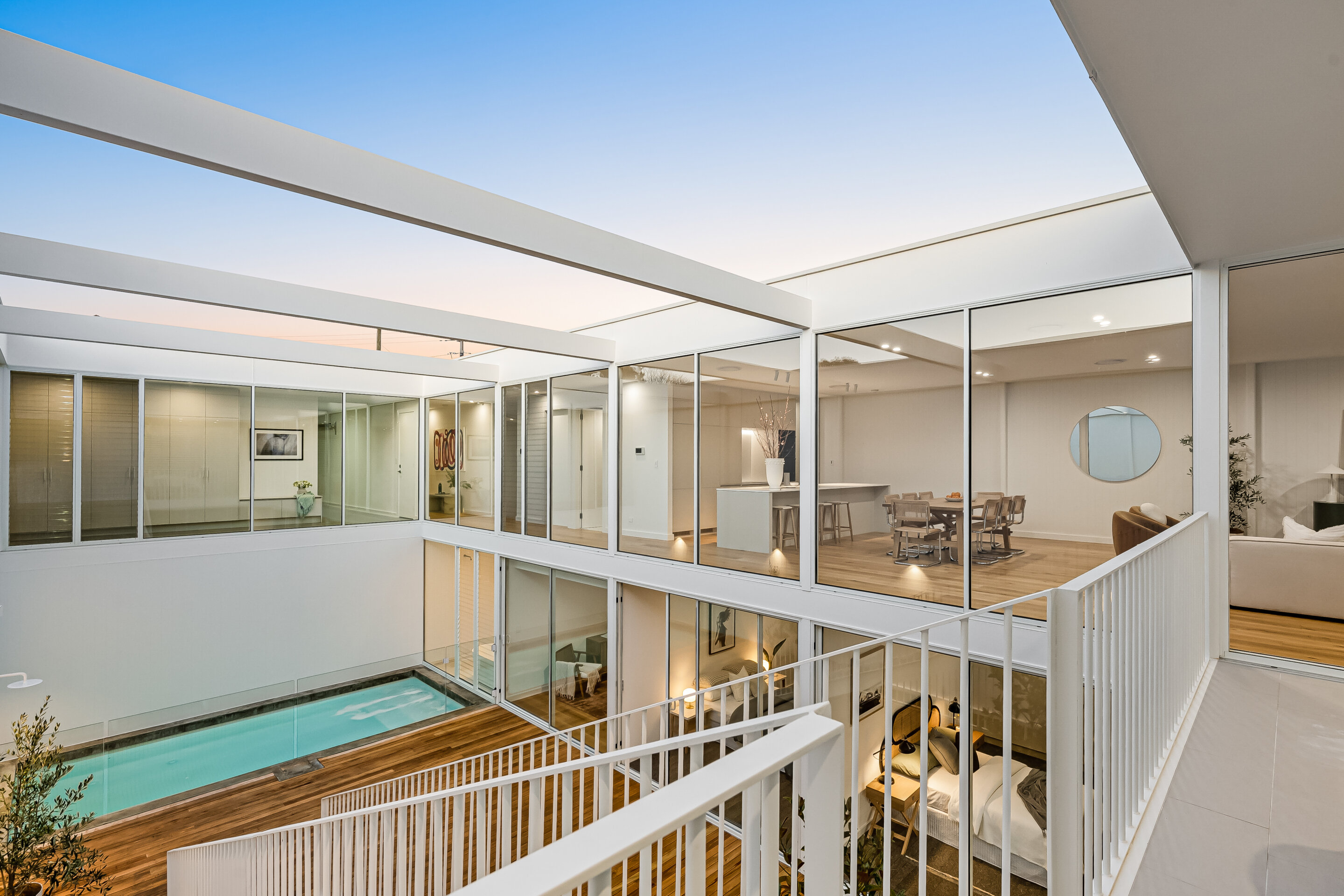 The design is modern with an open-plan entrance level, including a kitchen with European appliances, a living area, and a master bedroom with ensuite. Large glass walls in the living areas show views of the courtyard and pool. The lower level has more bedrooms, another living space, and a bathroom. There’s a garden at the rear for privacy. The McLaren St homes combine design and function.